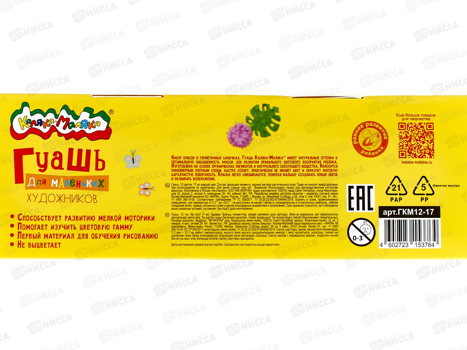 Гуашь Каляка-Маляка 17мл 12цв, Для самых маленьких ГКМ12-17 *24