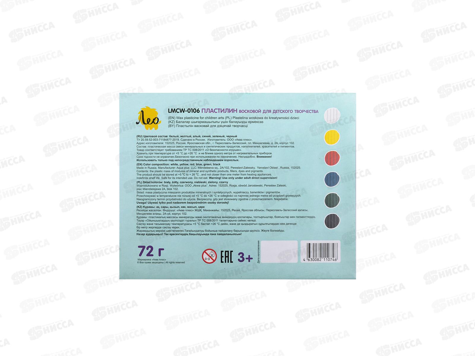 Пластилин 6цветов 72г "Лео" Расти, восковой картонная упаковка LMCW-0106 *36