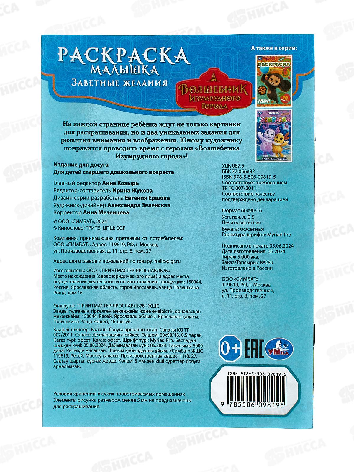 Раскраска-малышка «Волшебник Изумрудного города. Заветные желания» ТМ «УМка» непременно понравится юным поклонникам известной сказочной истории: