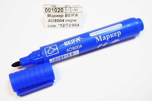 Перманентный, нестираемый маркер Beifa AD8004. Маркер заправлен перманентными нетоксичными чернилами на спиртовой основе. Нестираемые чернила пишут на любой поверхности - бумага, картон, пергамент, дерево, метал, пластик и т.д. Цвет чернил - синий. Форма наконечник - круглая, толщина - 3 мм.