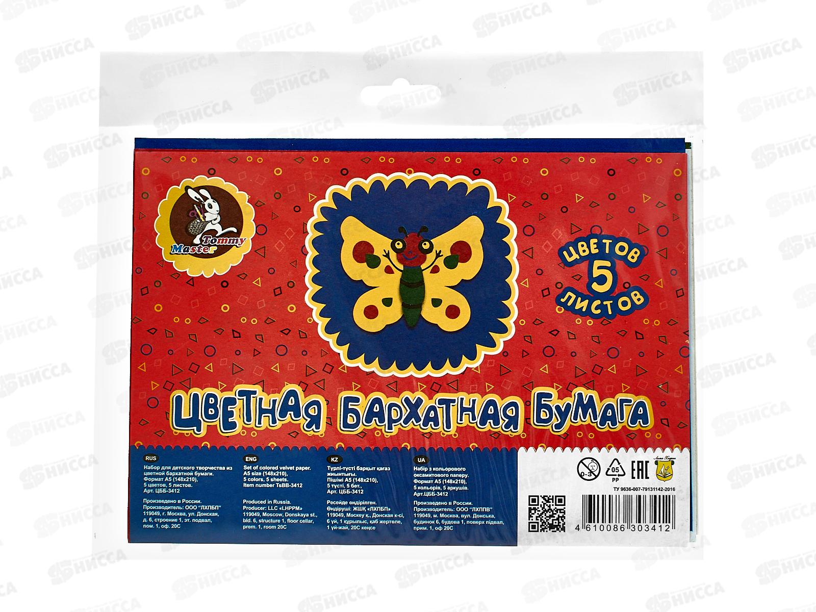 Набор цветной бархатной бумаги А5, 5цв.5л. (пакет на европодвесе), ЦББ-3412 *40