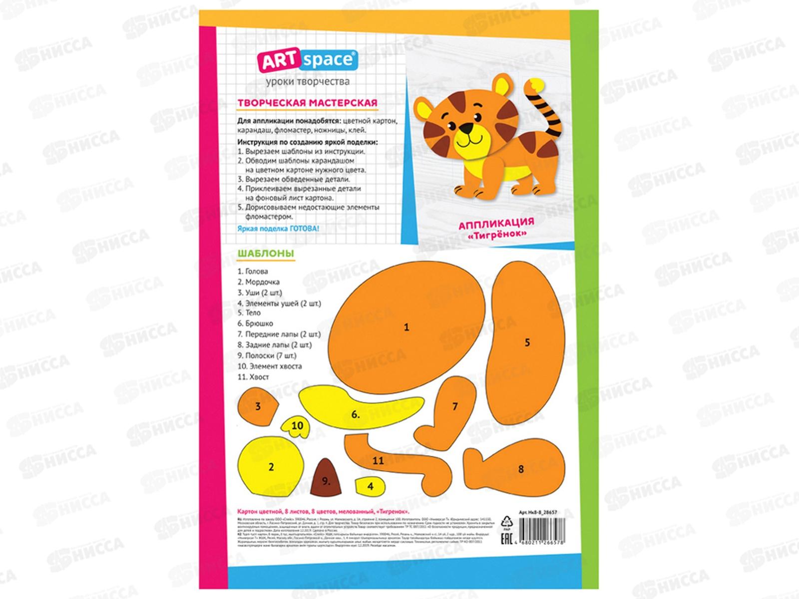 Цветной картон ArtSpace А4 8л 8цв Тигренок клей, 28657 *25