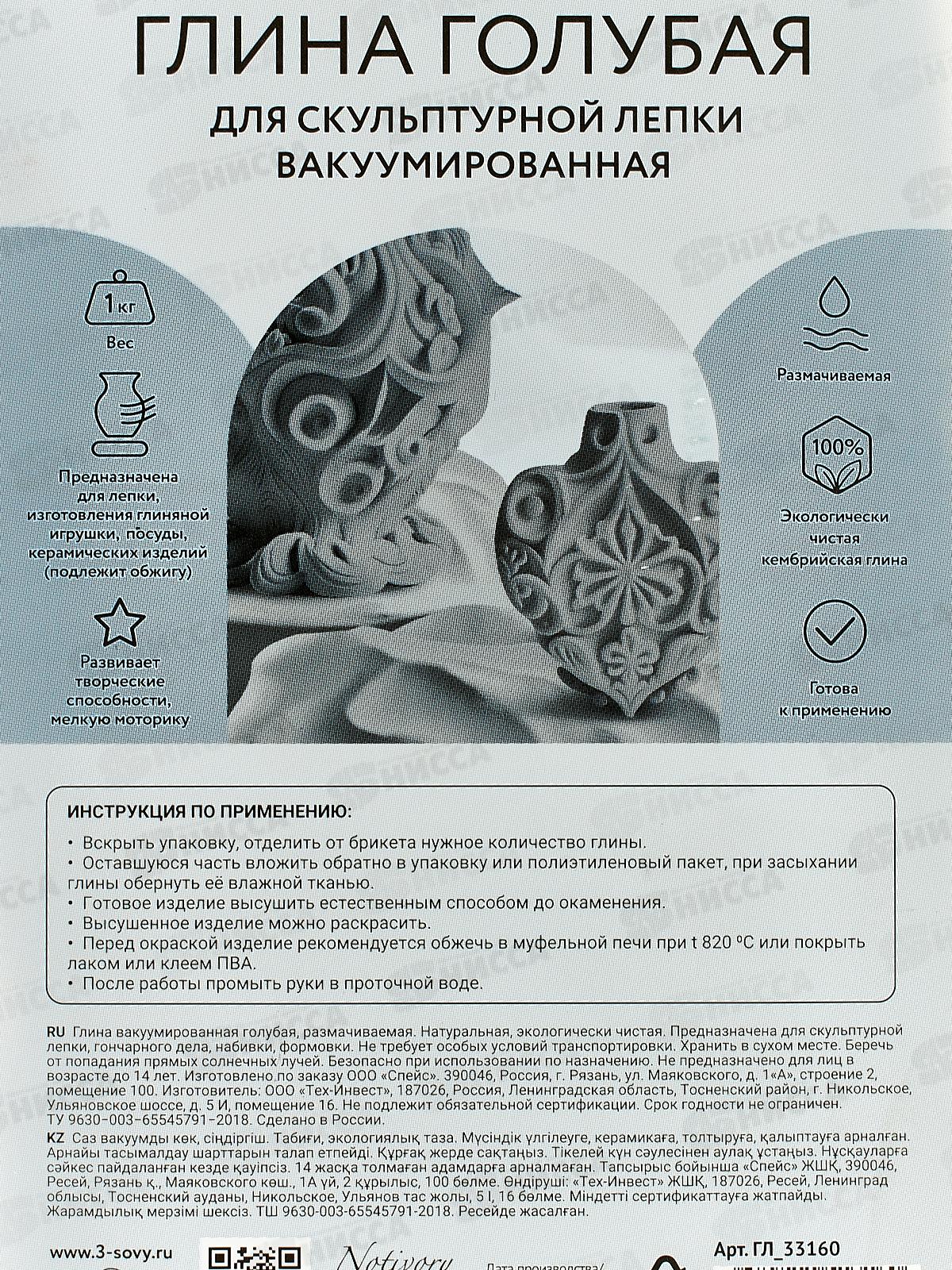 Глина ТРИ СОВЫ голубая,запекаемая,1кг,33160*20
