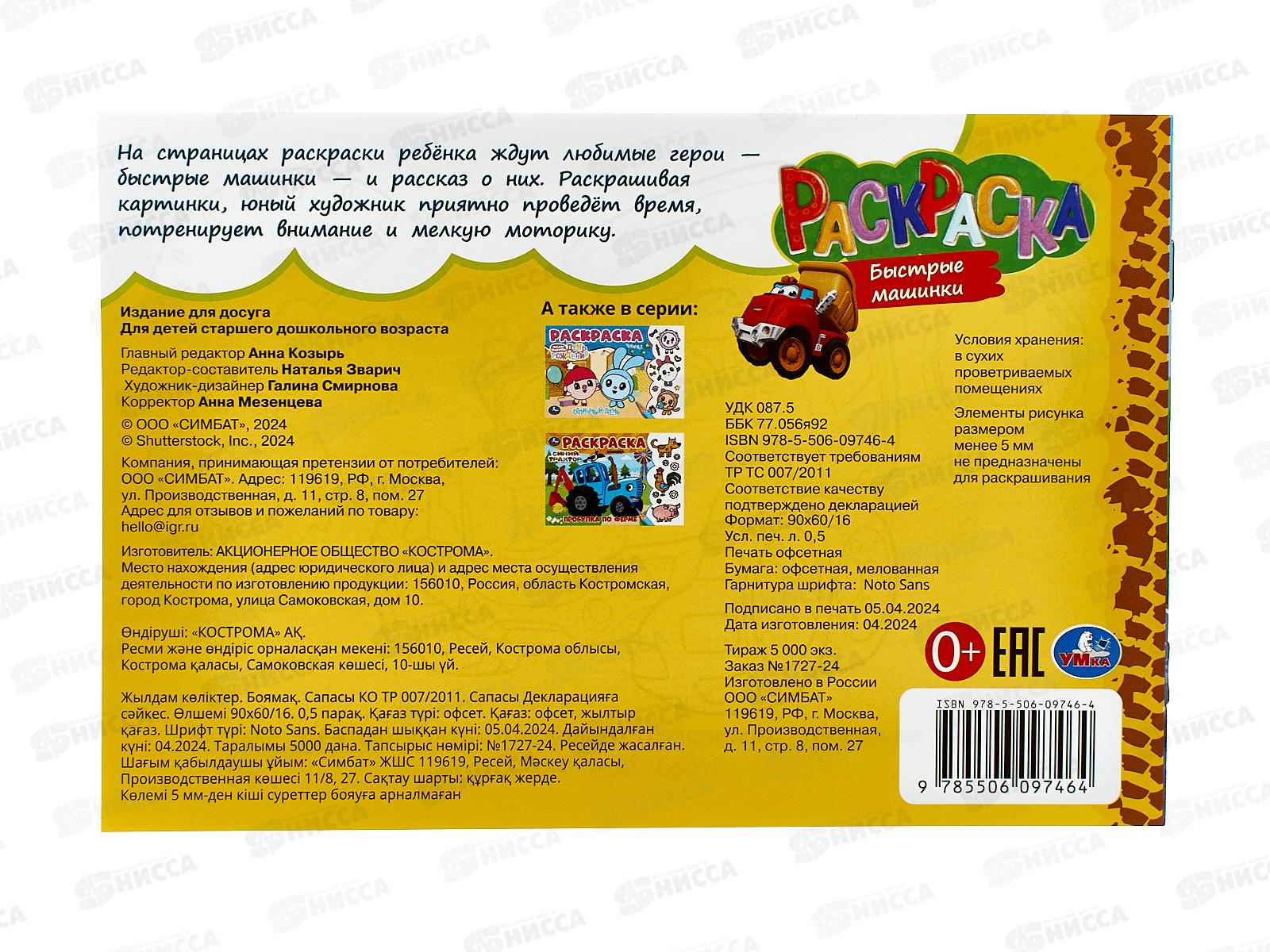 Раскраска "УМКА" 09746-4, Быстрые машинки. 8стр. 210х140мм *100