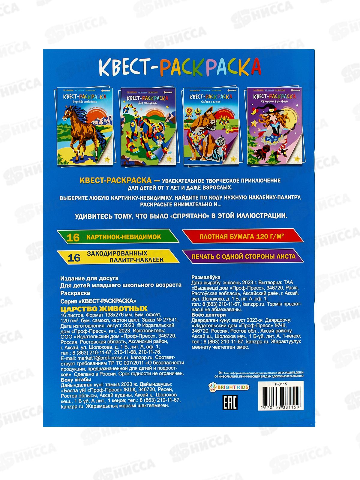 Раскраска ПП Царство животных, 16л+2л наклеек, Р-8115 *30