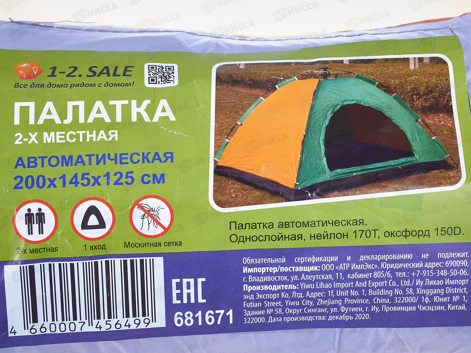 Палатка турист-я 2 мест (200*145*125см) автомат 1сл 681671