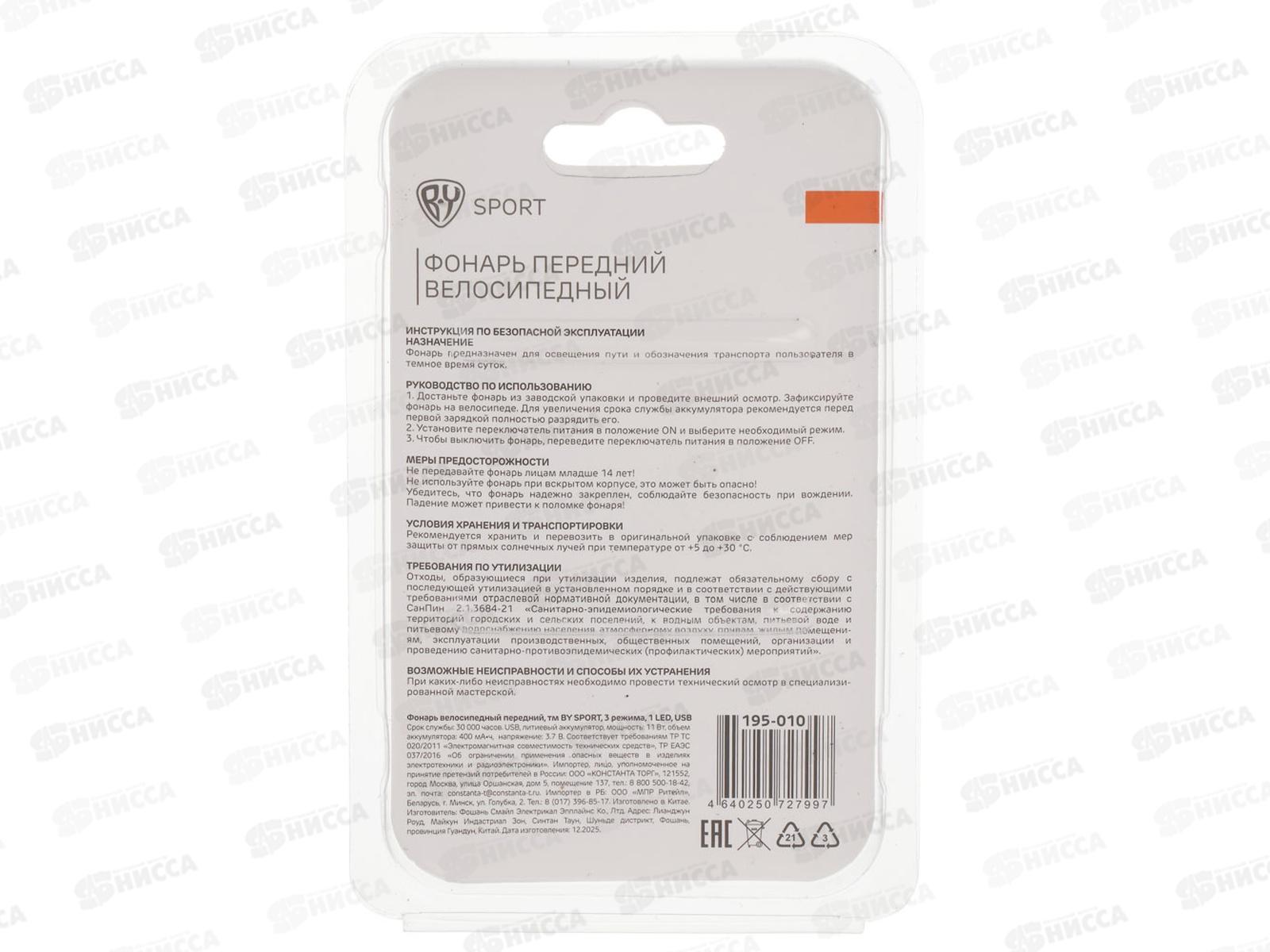 Фонарь велосипедный BY SPORT передний, 3 режима, 1LED, 195-010 г