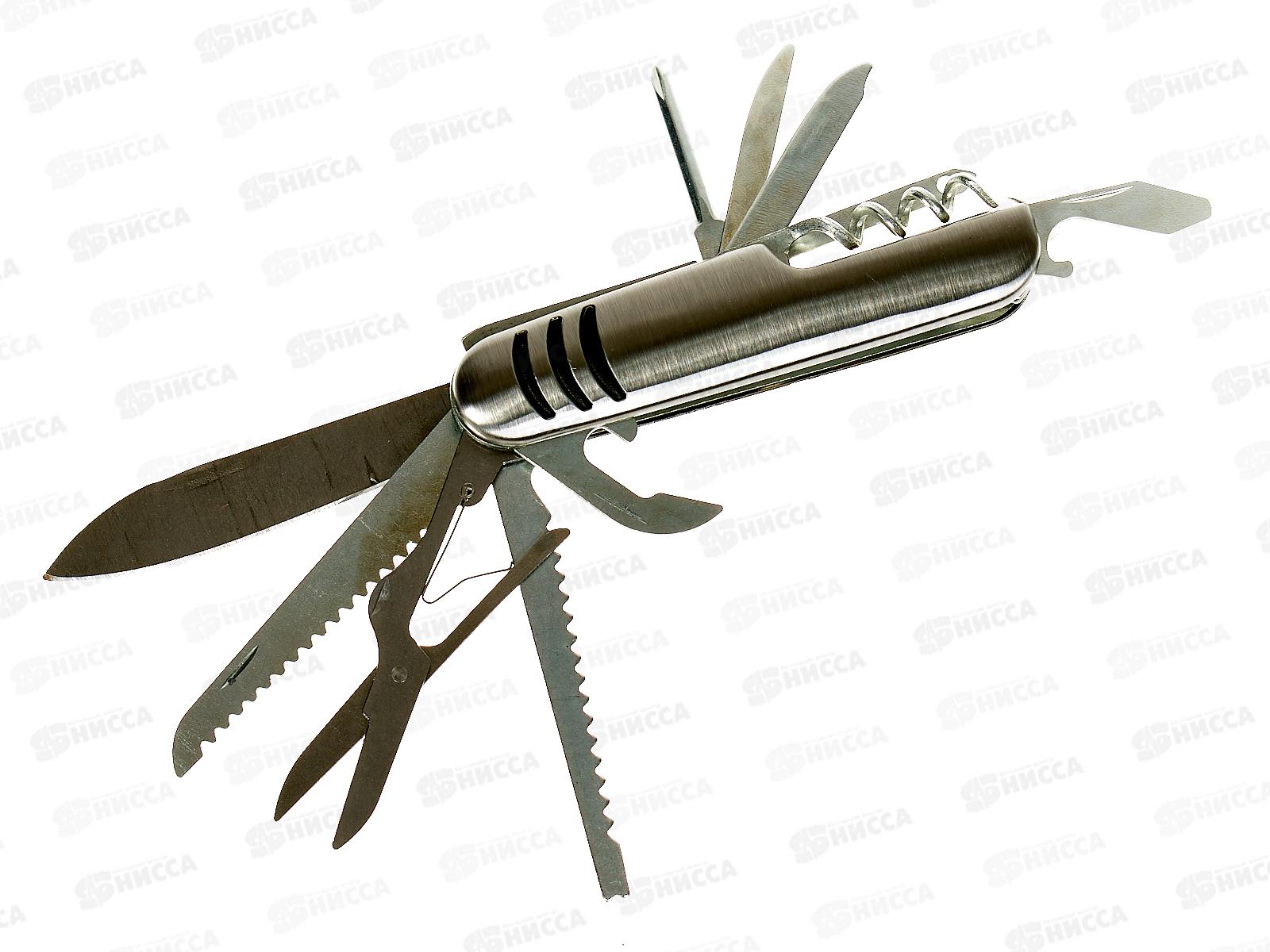 В комплект мультитула входят: нож, игла, шило, штопор, отвертка, ножницы, напильник, открывалка, двойная пила, одинарная пила, консервный нож