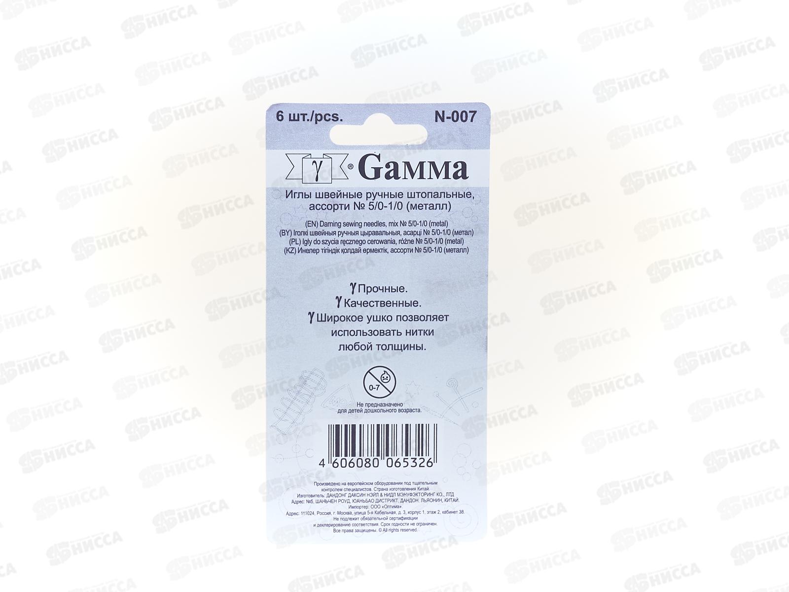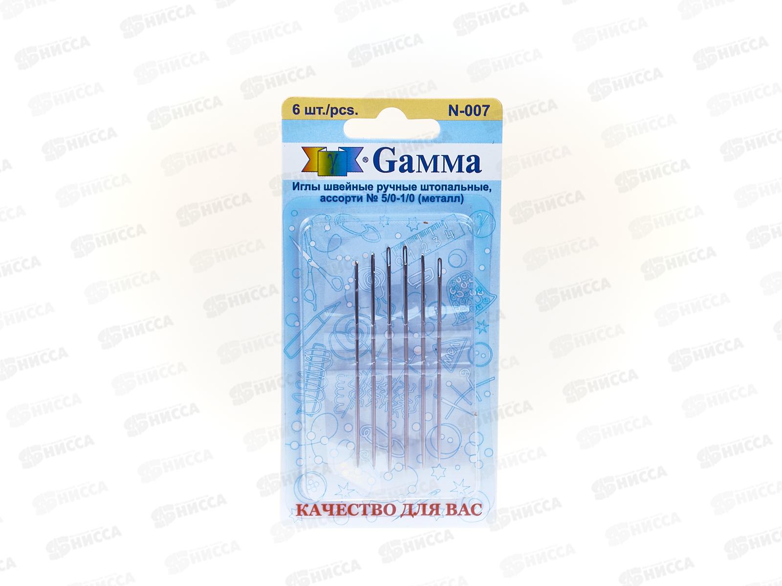 Иглы для шитья ручные "Gamma" N-007 для штопки №5/0-1/0 6шт блистер *10