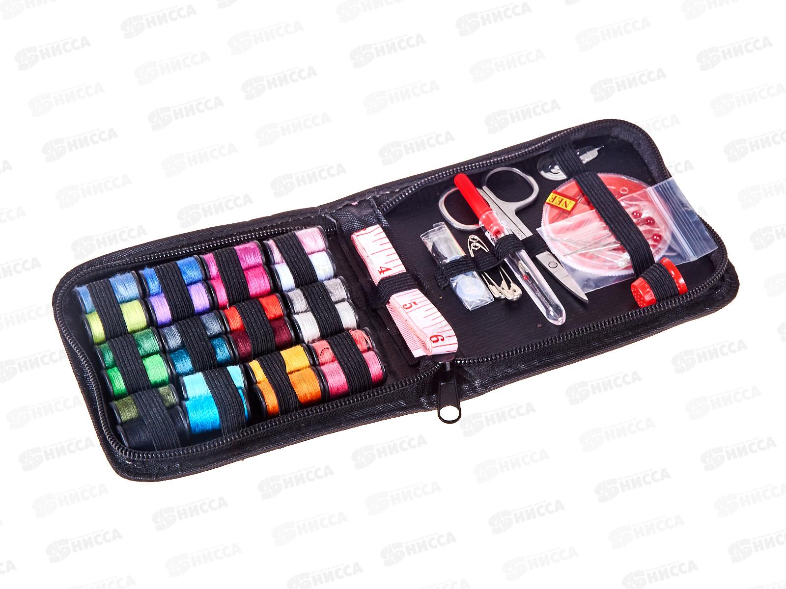 Состав набора: нитки - 24 цвета, иглы, булавки, сантиметровая лента, ножницы, нитевдеватель, наперсток пластиковый, английские булавки, вспарыватель, пуговицы – 2 шт.