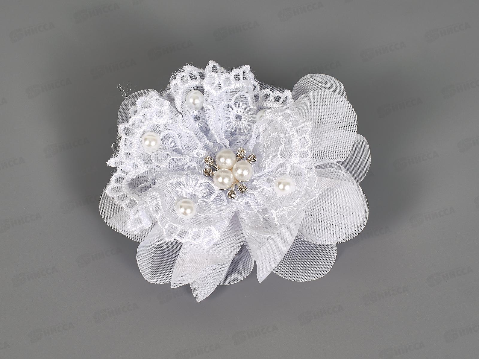 Бант гипюр, капрон белый круглый жемчуг стразы 10см №7980