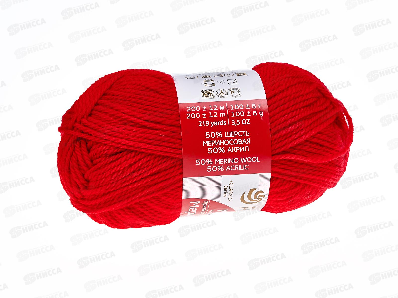 Пряжа Мериносовая 06 красный 100г шерсть50% акр50%