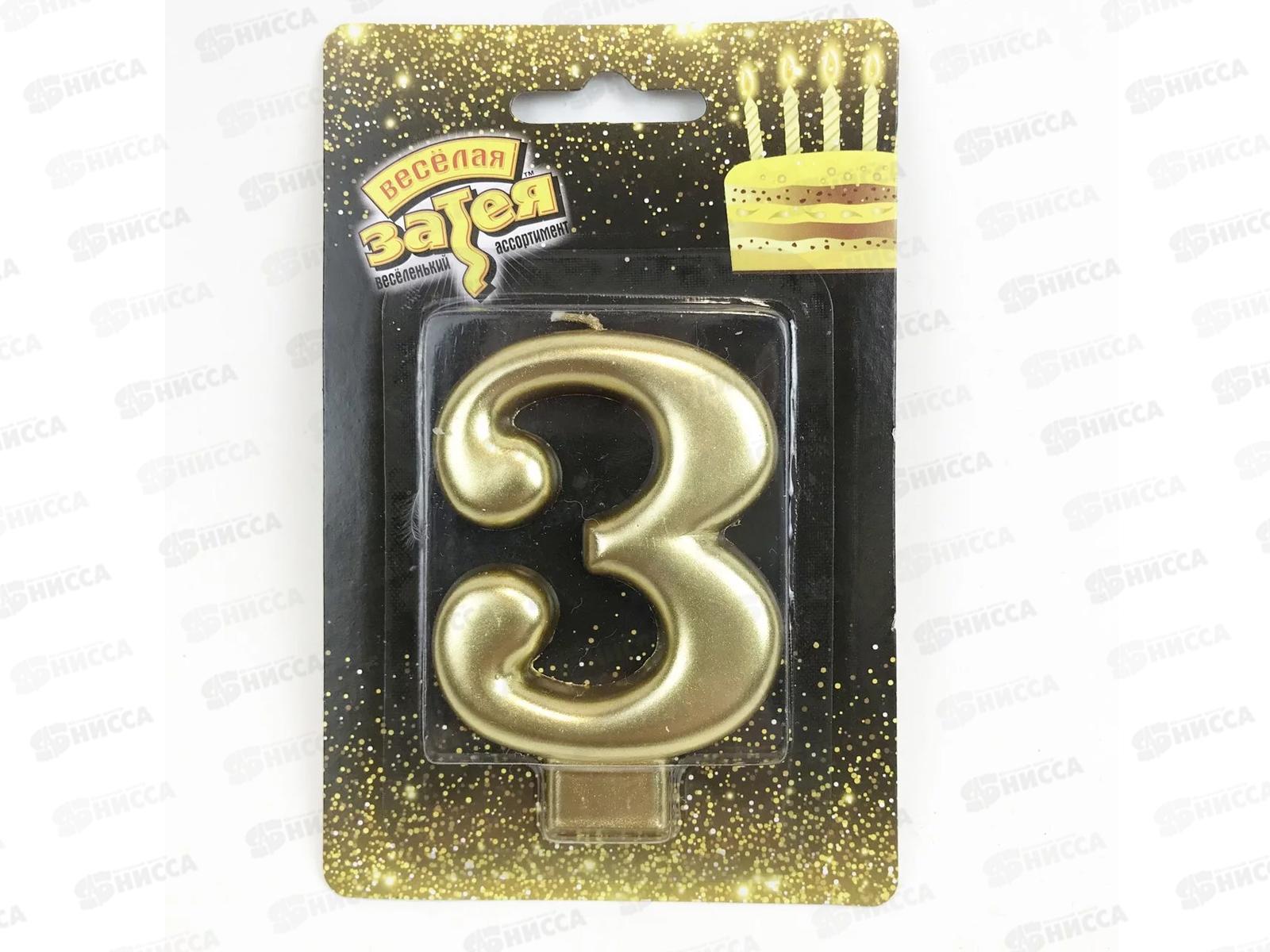 Свеча - цифра "3" Золотая 8см /V, 1502-2836
