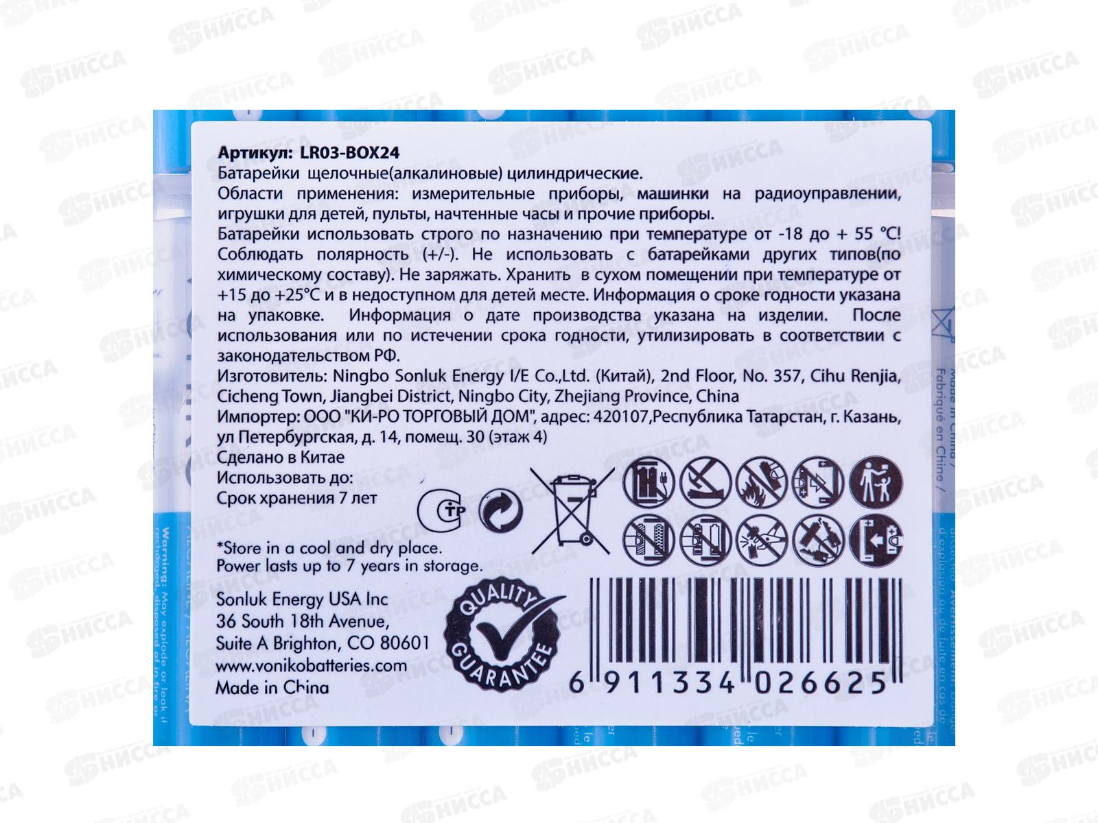 Батарейка VONIKO алкалиновая LR03 ААА, пластиковый бокс *24/192/768