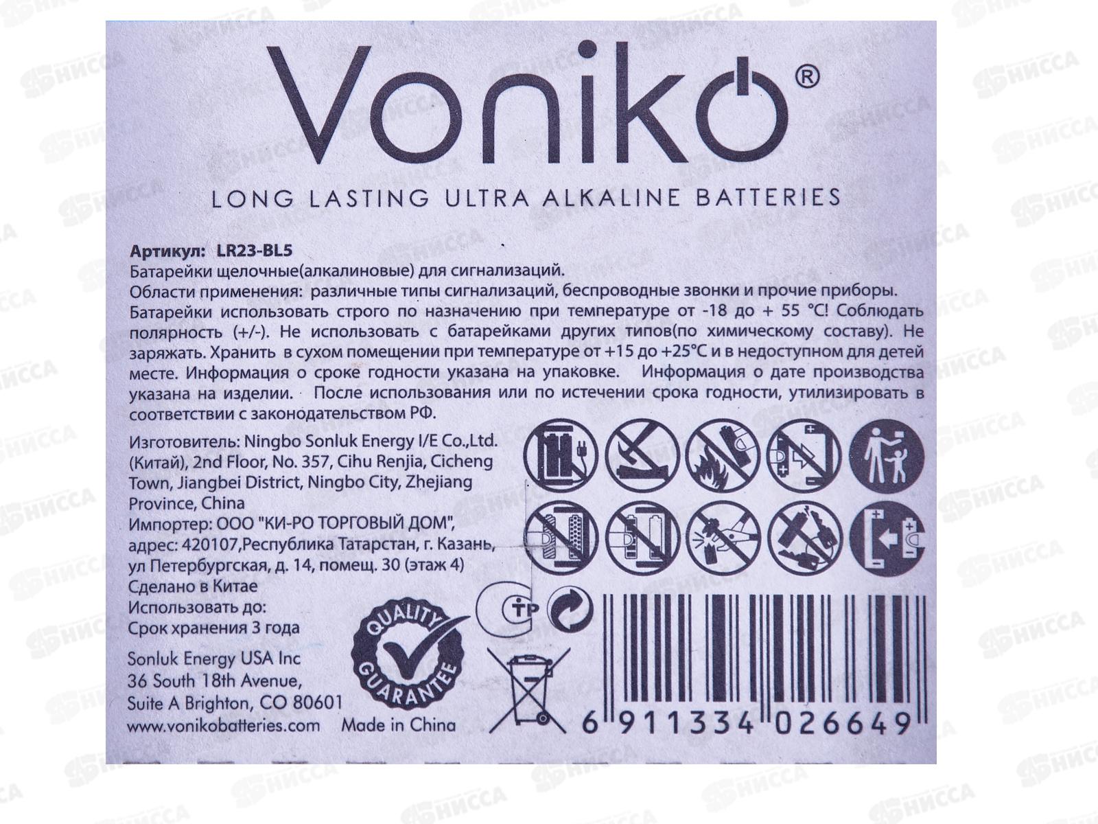 Батарейка VONIKO алкалиновая LR23, 12В *5/100/1000