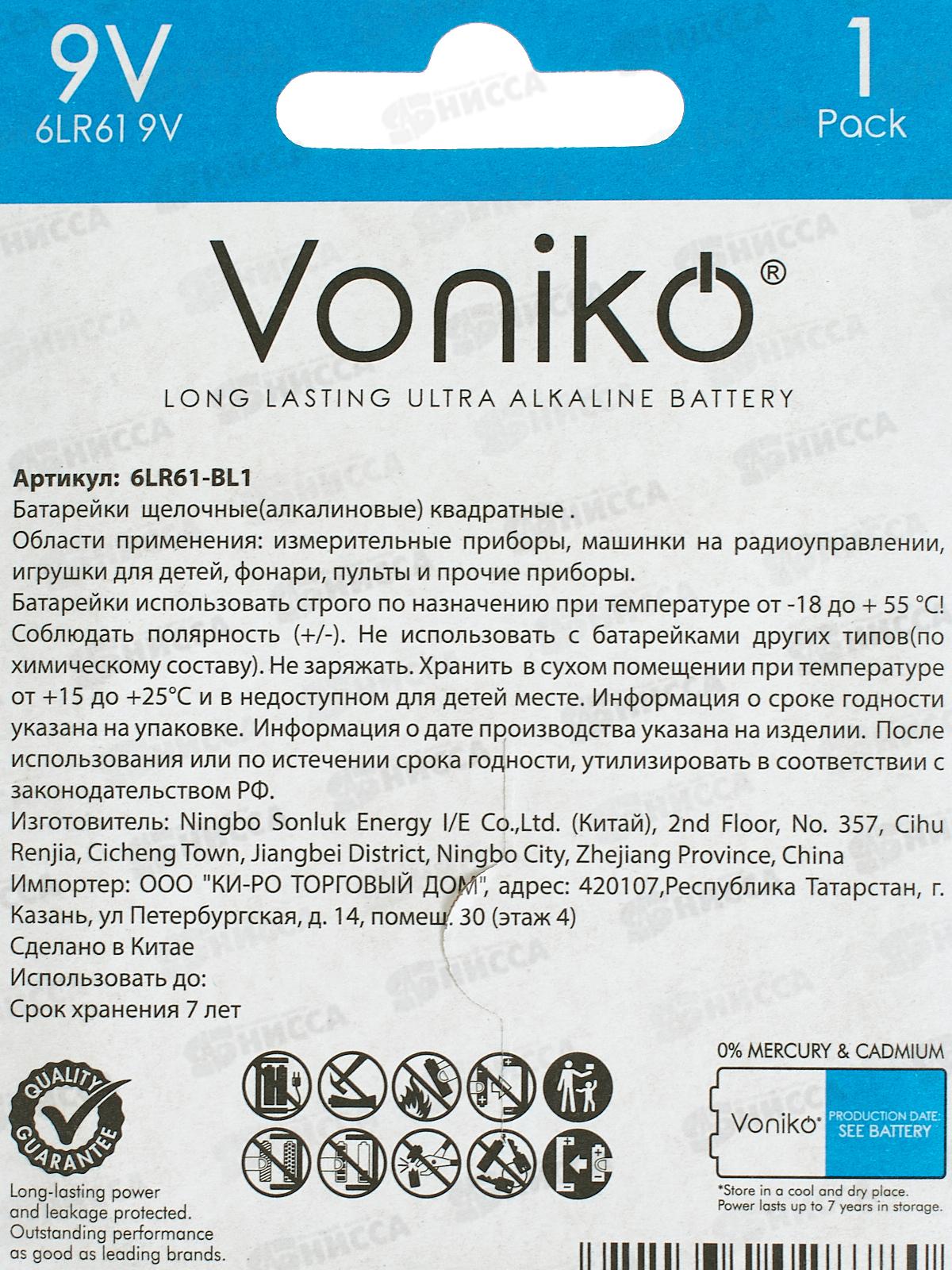 Батарейка VONIKO 6LR61, 9В *1/10