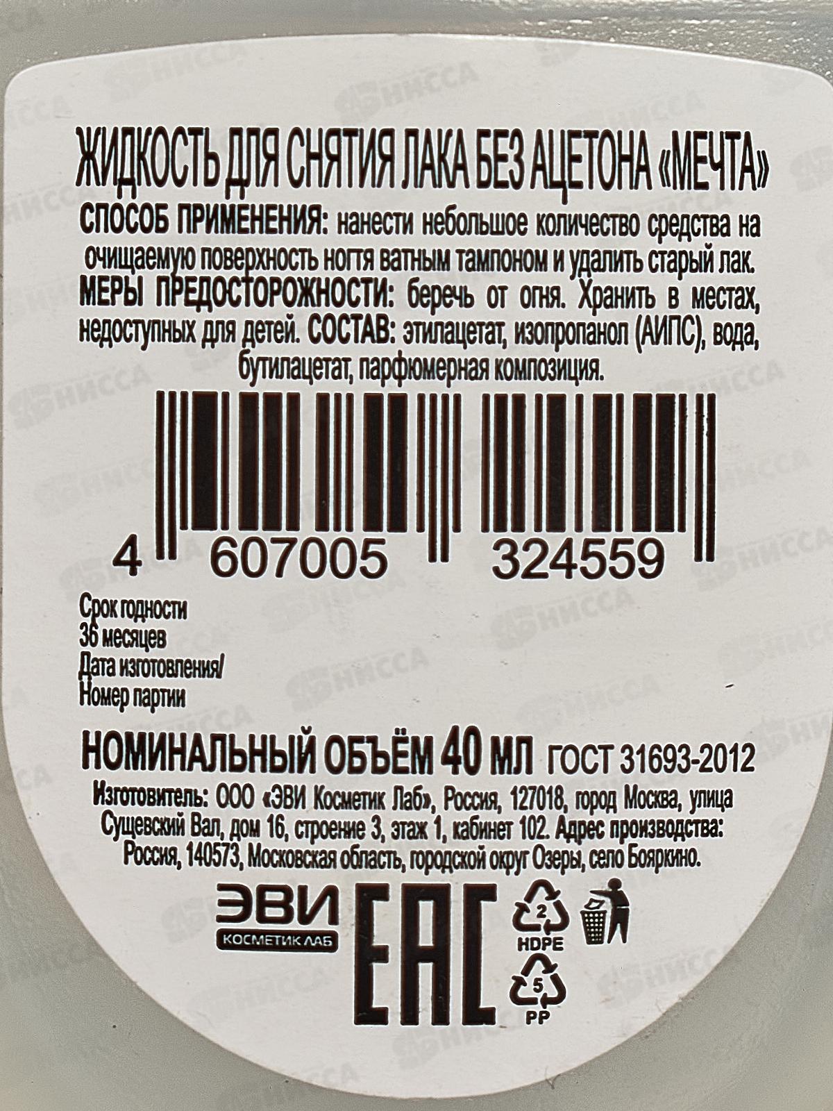 Жидкость для снятия лака Мечта без ацетона 40мл пластиковый флакон *36