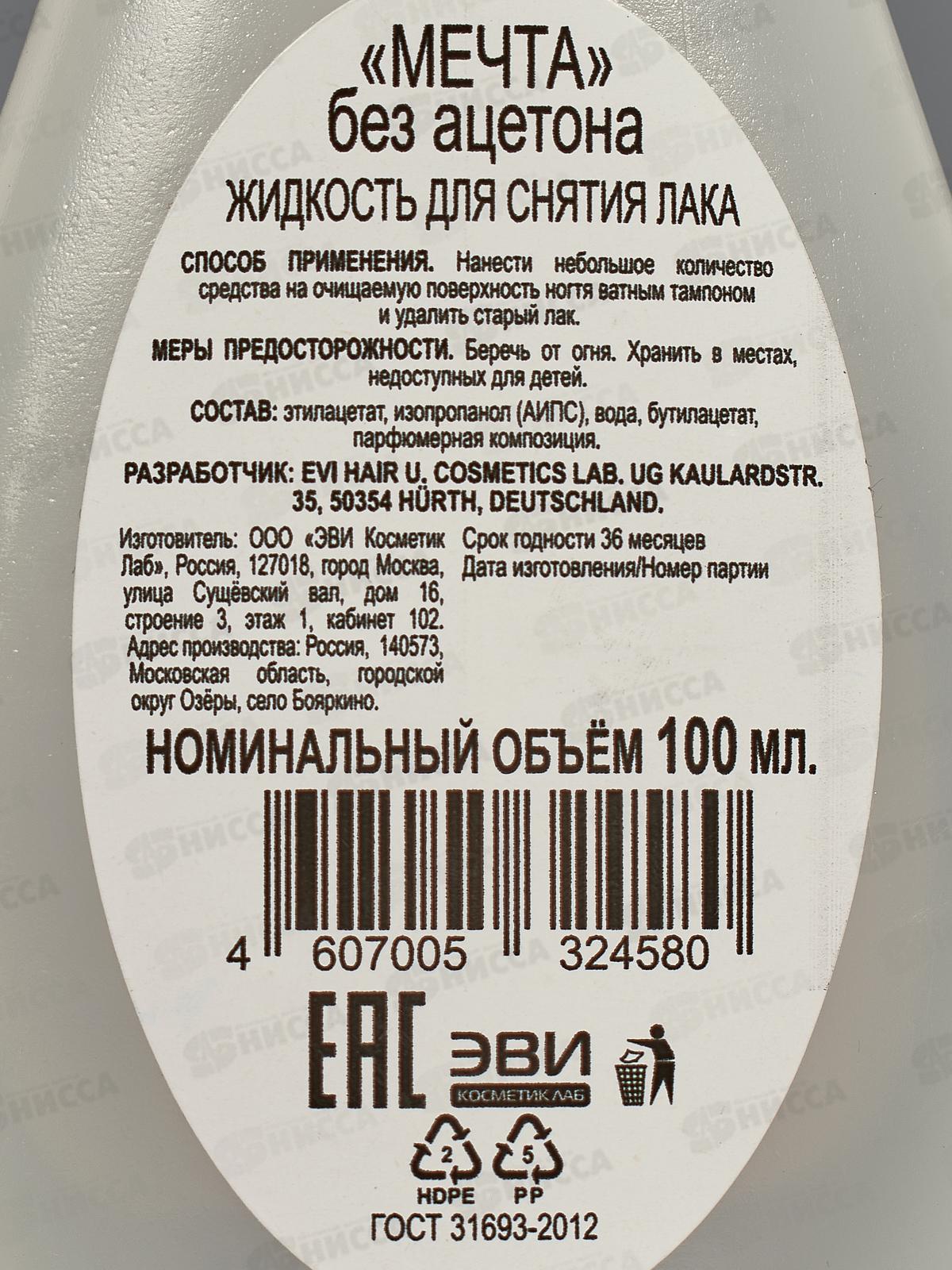 Жидкость для снятия лака "Мечта", без ацетона. Объем - 60 мл. Классическое средство для снятия лака, сочетающее в себе ухаживающие компоненты и активные вещества, позволяющие деликатно и быстро удалить декоративное лаковое покрытие с ногтей.