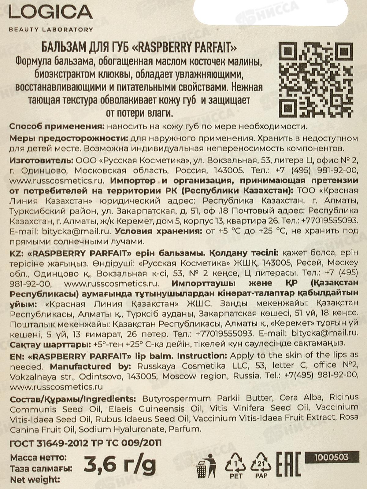 РК Biologica Бальзам для губ Raspberry Parfait Малина 3,6г