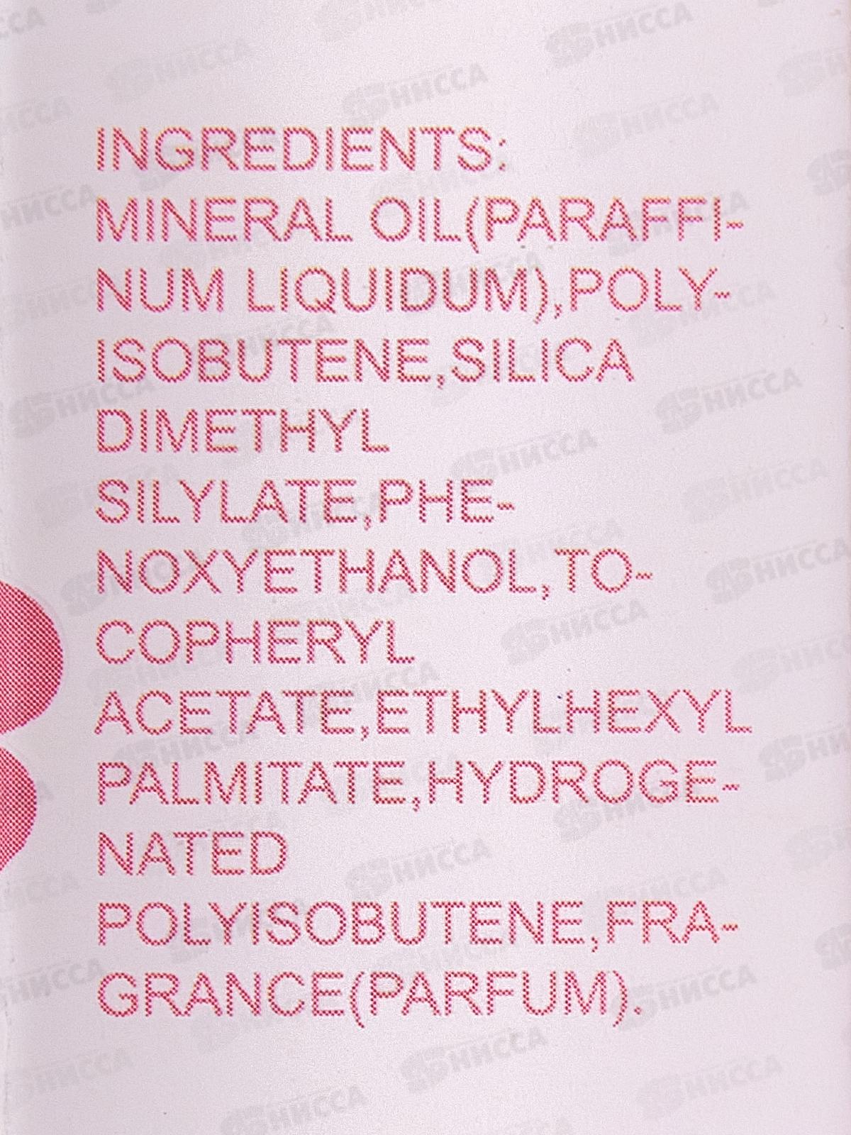 Состав: минеральное масло (paraffinum liquidium), полиизобутен, диметилсиликат, феноксиэтанол, токоферола ацетат, этилгексилпальмитат, гидрогенизированный полиизобутен, ароматизатор (parfum).