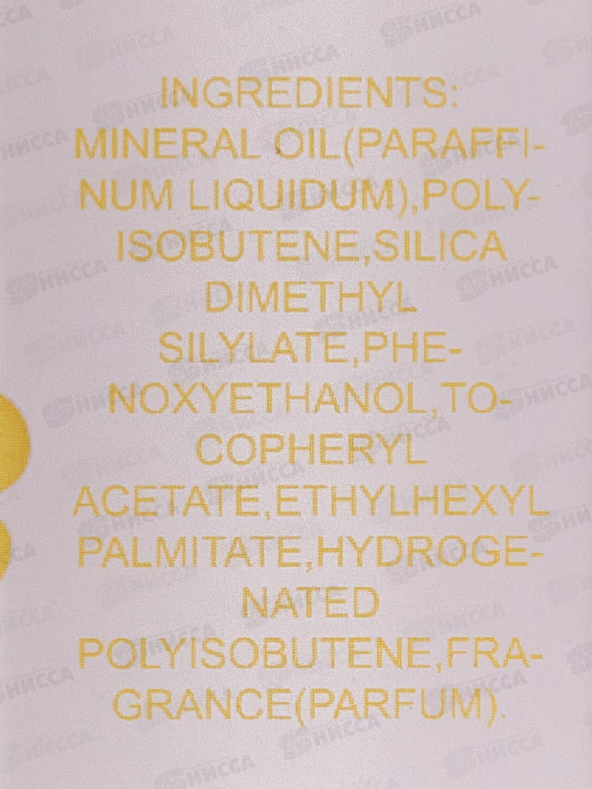 Состав: минеральное масло (paraffinum liquidium), полиизобутен, диметилсиликат, феноксиэтанол, токоферола ацетат, этилгексилпальмитат, гидрогенизированный полиизобутен, ароматизатор (parfum).