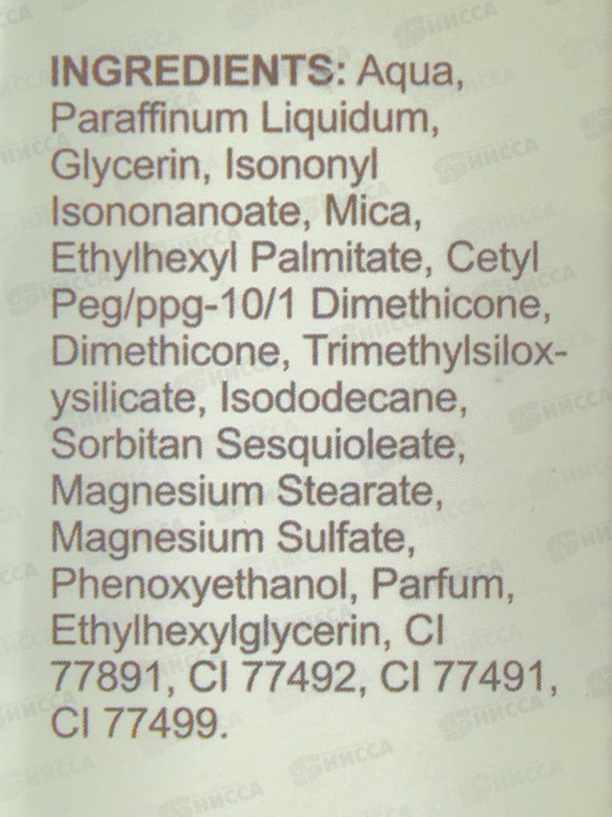 Состав: вода, вазелиновое масло, глицерин, изононилизононаноат, слюда, этилгексилпальмитат, цетиловый ПЭГ/ППГ-10/1 диметикон, диметикон, триметилсилоксисиликат, изододекан, сесквиолеат сорбитана, стеарат магния, сульфат магния, феноксиэтанол, отдушка, этилгексилглицерин, cl77891, cl77492, cl77491, cl77499.