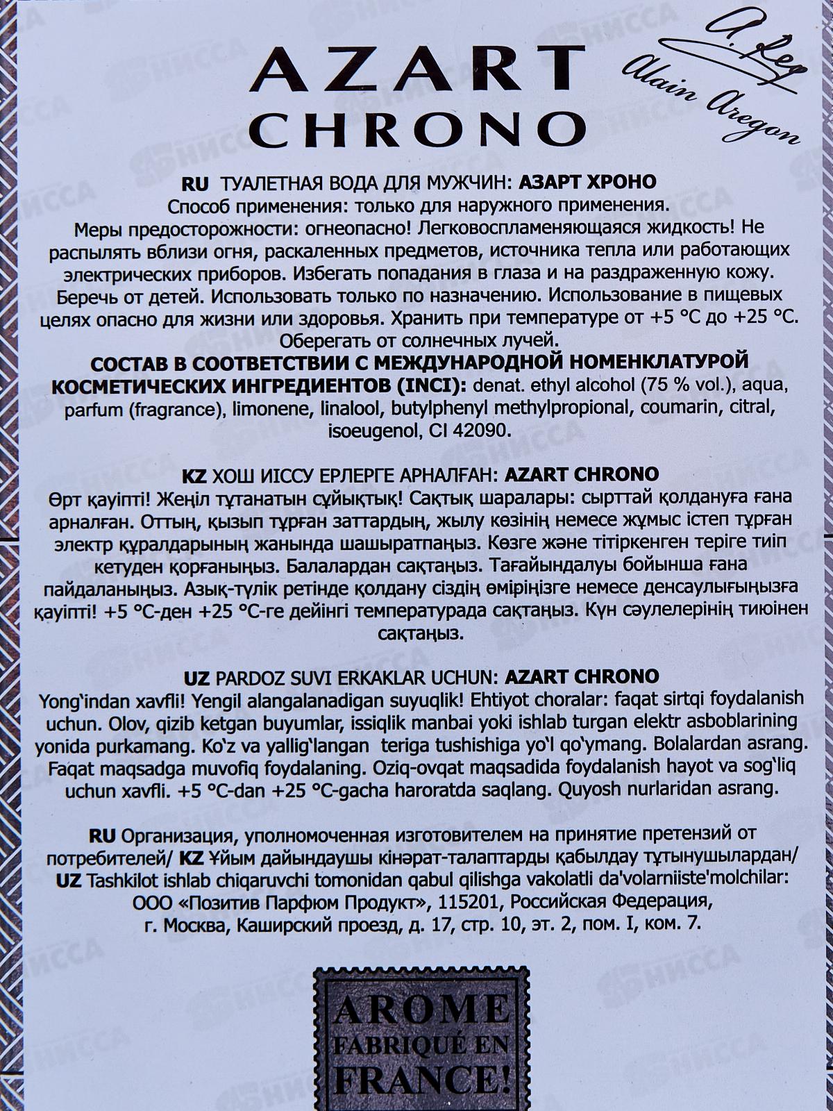 Чудные шедевры от Alain Aregon ежегодно занимали знатное место на полках эстетов парфюма, Azart Chrono так же в свою очередь не является исключением из этого утверждения.