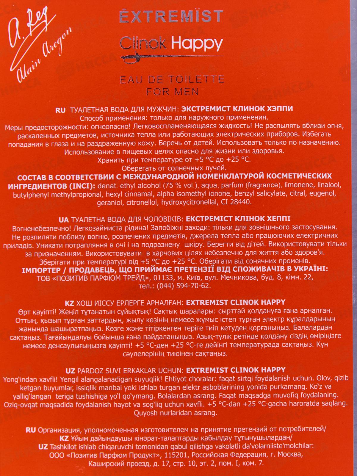 Extremist Clinok Happy - традиционный букет от Alain Aregon, манящий метаморфозами оттенков и нот. Лайм, цитрус, зеленые ноты и морские ноты - штрихи изумительной пирамиды, являющей собой голову этого аромата. Сердцем Extremist Clinok Happy облачаются жас