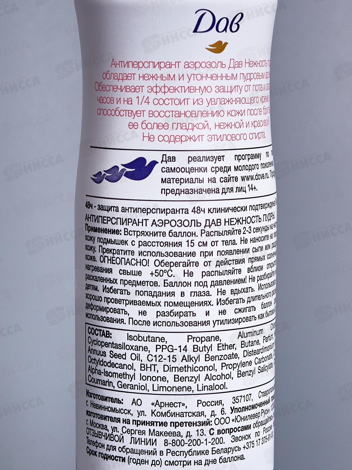 Дав антиперспирант-аэрозоль Нежность пудры, обеспечит качественный уход за кожей подмышек с любовью и заботой о теле. Антиперспирант для женщин и девушек от 14 лет надежно защищает от пота и его последствий в течение 48 ч. В формуле нет этилового спирта, потому антиперспирант не сушит кожу, а делает ее мягкой и гладкой. Спрей на четверть состоит из увлажняющего крема, обладает нежной текстурой и дарит ощущение комфорта. Утонченный цветочный аромат эффективно маскирует неприятные запахи. Антиперспирант-аэрозоль поможет восстановить поврежденную поверхность после бритья или эпиляции, устранит раздражение и покраснения. Наличие масла семян подсолнечника делает аэрозоль особенно деликатным по отношению к вашей коже. Витамины E и F в его составе помогают коже быстрее восстановиться.