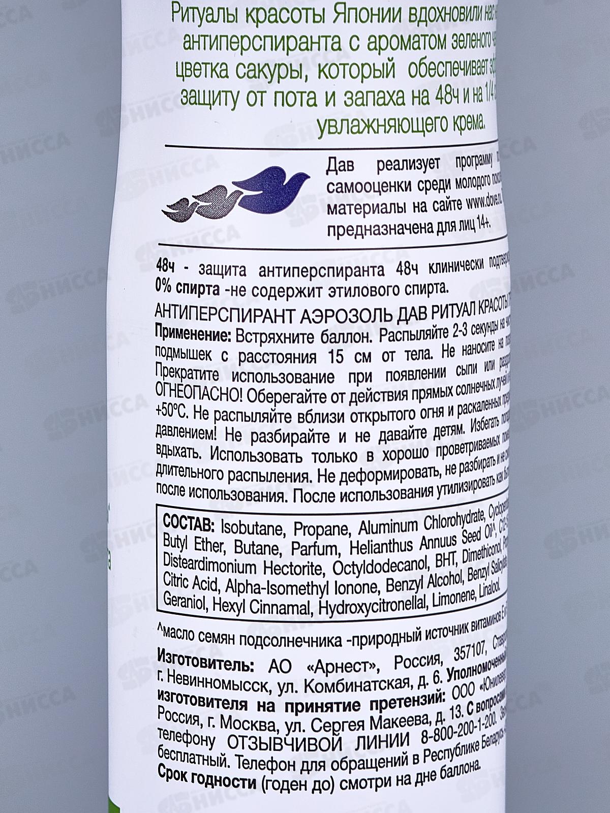 Дав антиперспирант-аэрозоль Ритуал красоты Пробуждение. Продукт имеет бодрящий аромат зеленого чая матча с нотками цветущей сакуры. Такое сочетание придаст вам дополнительную уверенность в защите от пота и неприятного запаха на протяжении 48 ч. Антиперспирант женский без этилового спирта не сушит кожу. Спрей на четверть состоит из увлажняющего крема и помогает бережно восстановить поврежденную поверхность подмышек после эпиляции. В состав продукта входит масло семян подсолнечника, в котором содержатся витамины E и F. Они защищают кожу, помогая ей быстрее справиться с повреждениями. Аэрозоль делает кожу гладкой и бархатистой.