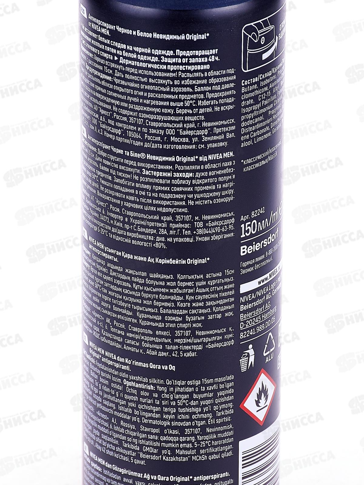 Дезодорант-антиперспирант спрей Нивея MEN Черное и Белое Невидимый предотвращает появление белых пятен на темной одежде и желтых пятен на светлой. Черная одежда остается черной, а белая одежда дольше остается белой. Защищает кожу подмышек от неприятного запаха в течение 48 часов. Не содержит этилового спирта. Настоящий мужской аромат для ощущения чистоты и свежести на весь день. Сильная защита и забота о коже от Нивея на каждый день!