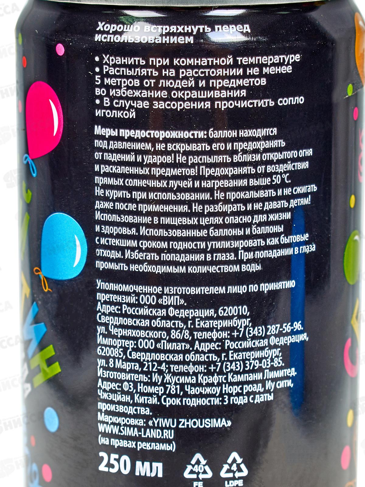 Инструкция: Тщательно встряхнуть перед применением. Для использования направить струю к цели в вертикальном положении и распылить спрей на расстоянии 10-15 см от объекта. Внимание! Не переворачивайте баллон вверх дном во время использования.