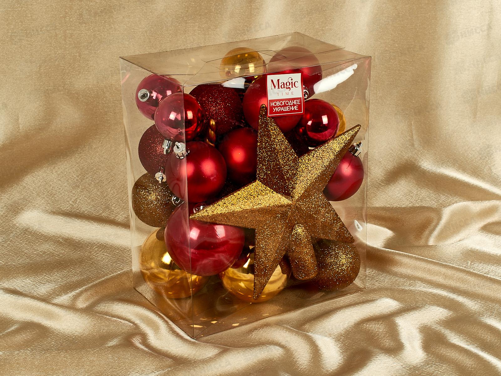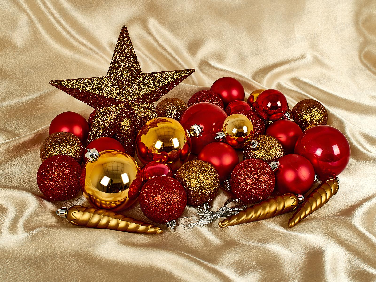 Состав набора: шар 5 см - 7 шт, шар 6 см - 18 шт, шар 8 см-4 шт, сосулька 12 см - 3 шт, наконечник-звезда - 1 шт.