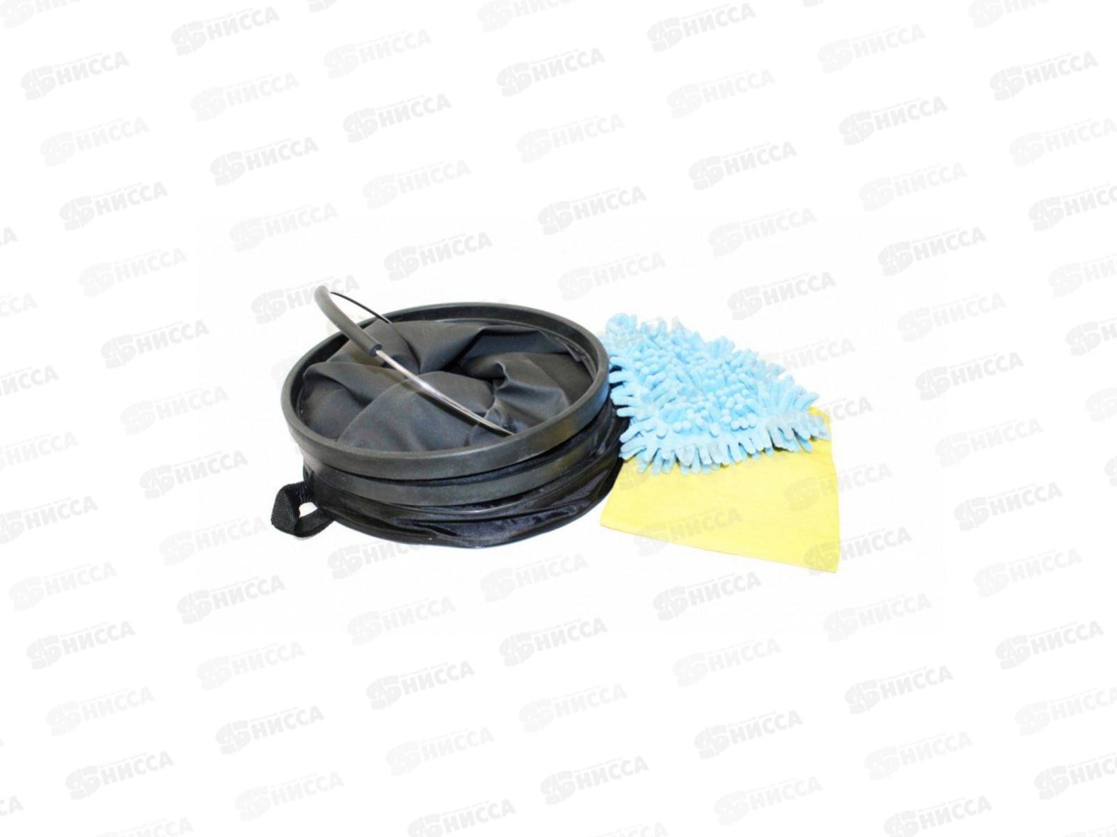 Комплектация: складывающееся водонепроницаемое ведро, рукавица из микрофибры, салфетка из