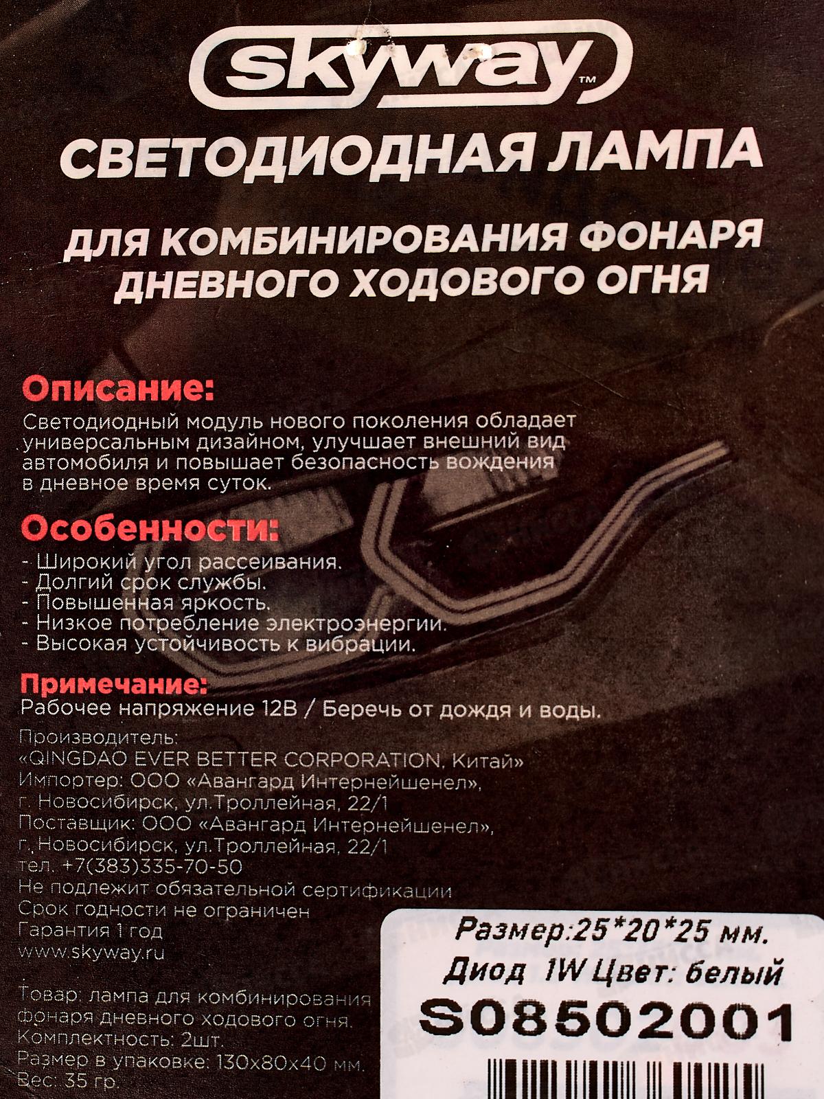 Лампа для комбинирования фонаря дневного ходового огня SKYWAY 12V 1 сверхмощный диод Белая 1W (~25*20*25мм) 2шт, S0850200