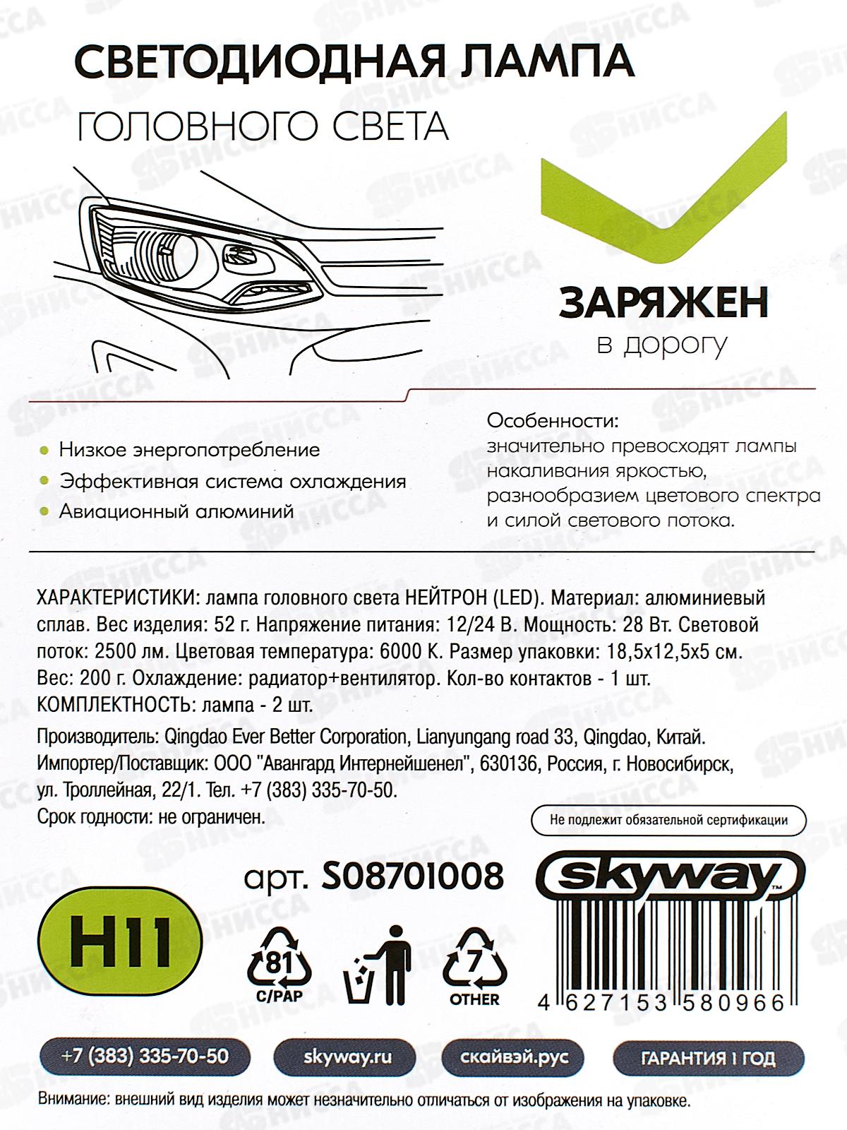 Автолампа-LED (аналог ксенона) H11(X7) 12/24V 28W 6000K 2500Lm 1-конт SKYWAY комп.2 шт радиатор+вентилятор охл - Светодиодные лампы являются долговечным и наиболее практичным источником света. Лампа отличается от обычных более длительным сроком службы за счет качественной пайки элементов, ярким освещением. Данная модель сделана из экологически чистого материала, который также предотвращает перегрев и преждевременное перегорание лампы. Легко устанавливается, экономично расходует заряд аккумулятора.