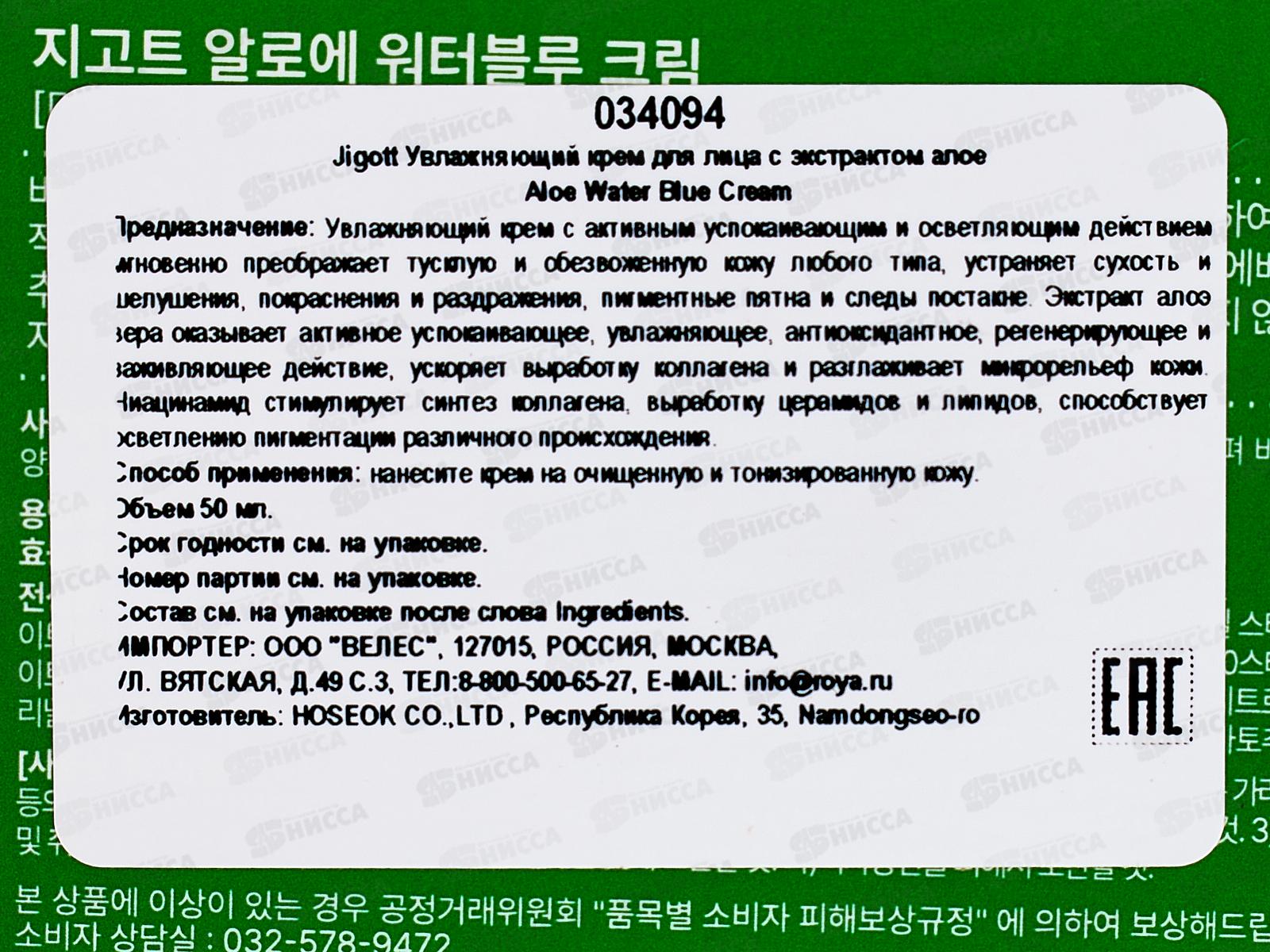 Крем для лица с алоэ Jigott Aloe Water Blue Cream. Крем с нежной сливочной текстурой быстро впитывается в кожу, не оставляет на лице жирного блеска, не липнет, не утяжеляет макияж. Подходит для сухой, обезвоженной или чувствительной кожи: экстракты алоэ вера и зелёного чая, экстракт гнёзд стрижей саланганов, аллантоин, аденозин, ниацинамид. Ниацинамид ускоряет производство в коже коллагена и керамидов, повышает плотность и эластичность кожи. Аденозин ускоряет заживление ранок и микротравм. Аллантоин смягчает кожу и помогает удерживать влагу. Экстракт птичьих гнёзд обладает мощным антивозрастным действием: он мгновенно подтягивает кожу. Алоэ вера и зелёный чай обладают успокаивающим и увлажняющим действием. Способ применения: нанесите небольшое количество крема на лицо и шею после умывания и использования тоника. Распределите по коже мягкими массирующими или похлопывающими движениями.