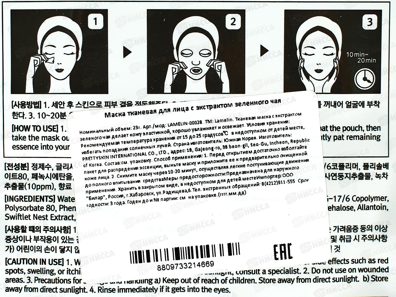 Lamelin маска для лица тканевая 23гр Зеленый чай *500