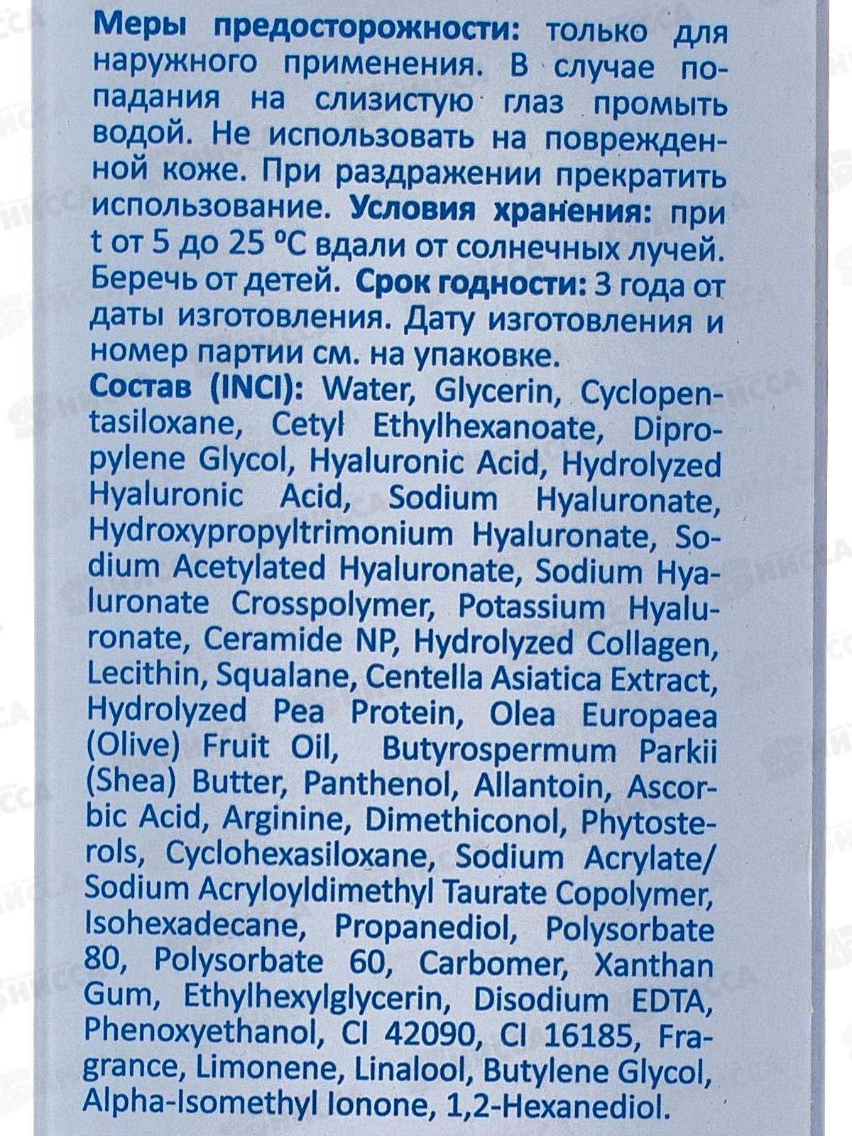 Состав: вода, Глицерин, Циклопентасилоксан, Цетилэтилгексаноат, Дипропиленгликоль, Гиалуроновая кислота, Гидролизованная гиалуроновая кислота, Гиалуронат натрия, Гиалуронат гидроксипропилтримония, Ацетилированный гиалуронат натрия, Кроссполимер гиалуроната натрия, Гиалуронат калия, Керамид NP, Гидролизованный коллаген, Лецитин, Сквалан, Экстракт центеллы азиатской, Гидролизованный гороховый протеин, Масло плодов оливы (Olea Europaea), Масло ши (Butyrospermum Parkii), Пантенол, Аллантоин, Аскорбиновая кислота, Аргинин, Диметиконол, Фитостеролы, Циклогексасилоксан, Сополимер акрилата натрия/акрилоилдиметилтаурата натрия, Изогексадекан, Пропандиол, Полисорбат 80, полисорбат 60, карбомер, ксантановая камедь, этилгексилглицерин, динатриевая соль ЭДТА, феноксиэтанол, CI 42090, CI 16185, отдушка, лимонен, линалоол, бутиленгликоль, альфа-изометилионон, 1,2-гександиол.