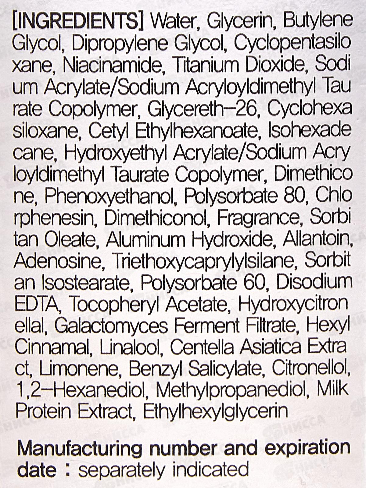 Состав: вода, минеральное масло, глицерин, бутиленгликоль, цетиловый спирт, 1,2-гександиол, стеариновая кислота, пчелиный воск, стеарат ПЭГ-100, глицерилстеарат, полисорбат 60, диметикон, фильтрат фермента галактомисис, экстракт центеллы азиатской, триэтаноламин, карбомер, экстракт молока, гидролизованный молочный белок, аллантоин, отдушка, аденозин, динатриевая соль ЭДТА, бензилсалицилат, гидроксицитронеллаль, лимонен.