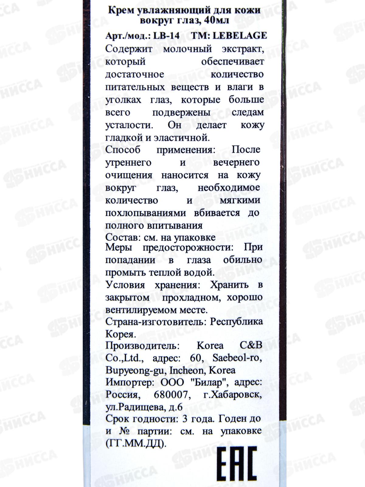 Lebelage крем вокруг глаз Увлажняющий Молочн протеины 40мл