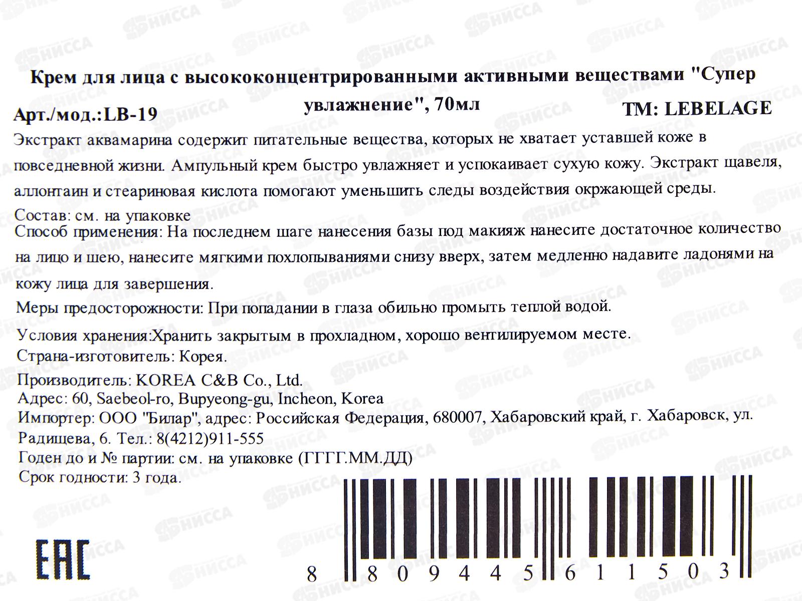 Lebelage крем для лица Супер увлажнение, Морская вода 70мл банка *1