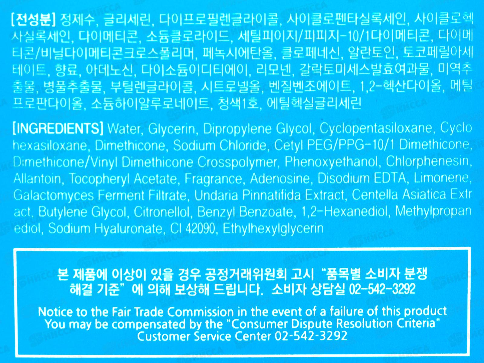 Состав: вода, Глицерин, дипропиленгликоль, циклопентасилоксан, циклогексасилоксан, диметикон, хлорид натрия, цетил ПЭГ/ППГ-10/1 диметикон, кроссполимер диметикона/винилдиметикона, феноксиэтанол, хлорфенезин, аллантоин, токоферилацетат, отдушка, аденозин, динатриевая соль ЭДТА, лимонен, фильтрат фермента галактомицетов, экстракт ундарии перистонадрезанной, экстракт центеллы азиатской, бутиленгликоль, цитронеллол, бензилбензоат, 1,2-гександиол, метилпропандиол, гиалуронат натрия, CI 42090, этилгексилглицерин.