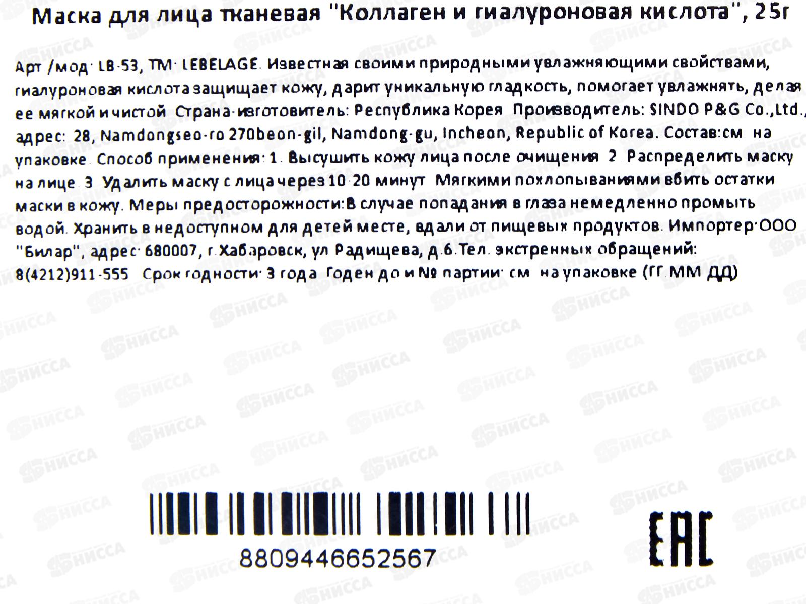 Lebelage Маска д/л Сияние увлажнение Коллаген 25гр ткан