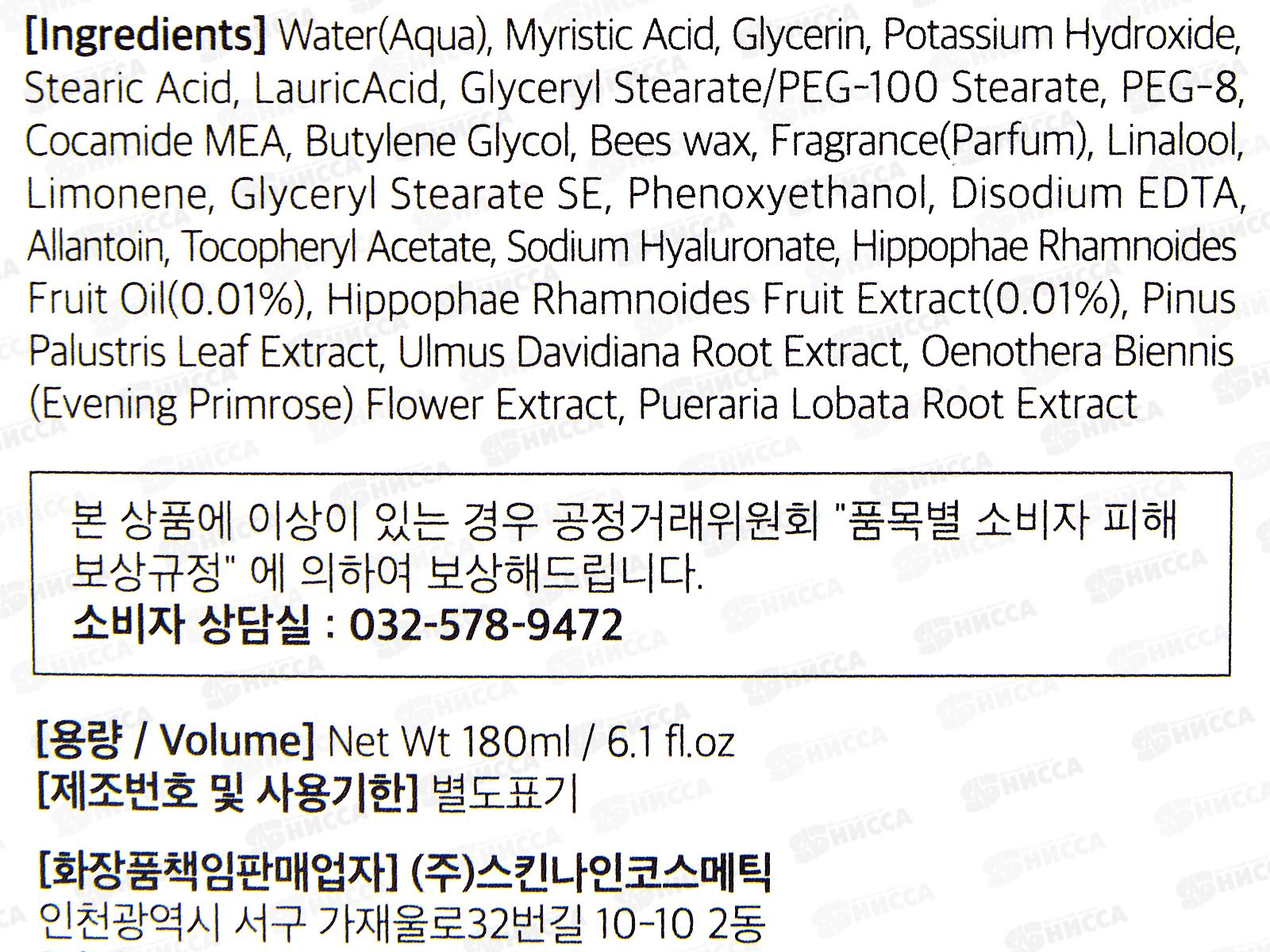 Состав: вода, миристиновая кислота, глицерин, гидроксид калия, стеариновая кислота, лауриновая кислота, глицерилстеарат/стеарат ПЭГ?100, ПЭГ?8, кокамид МЕА, бутиленгликоль, пчелиный воск, парфюмерная композиция, линалоол, лимонен, глицерилстеарат SE, феноксиэтанол, динатриевая соль ЭДТА, аллантоин, ацетат токоферила, гиалуронат натрия, масло плодов облепихи крушиновидной, экстракт плодов облепихи крушиновидной, экстракт листьев сосны болотной, экстракт корня ильма давидова, экстракт цветков энотеры двулетней (вечерней примулы), экстракт корня пуэрарии лопастной.