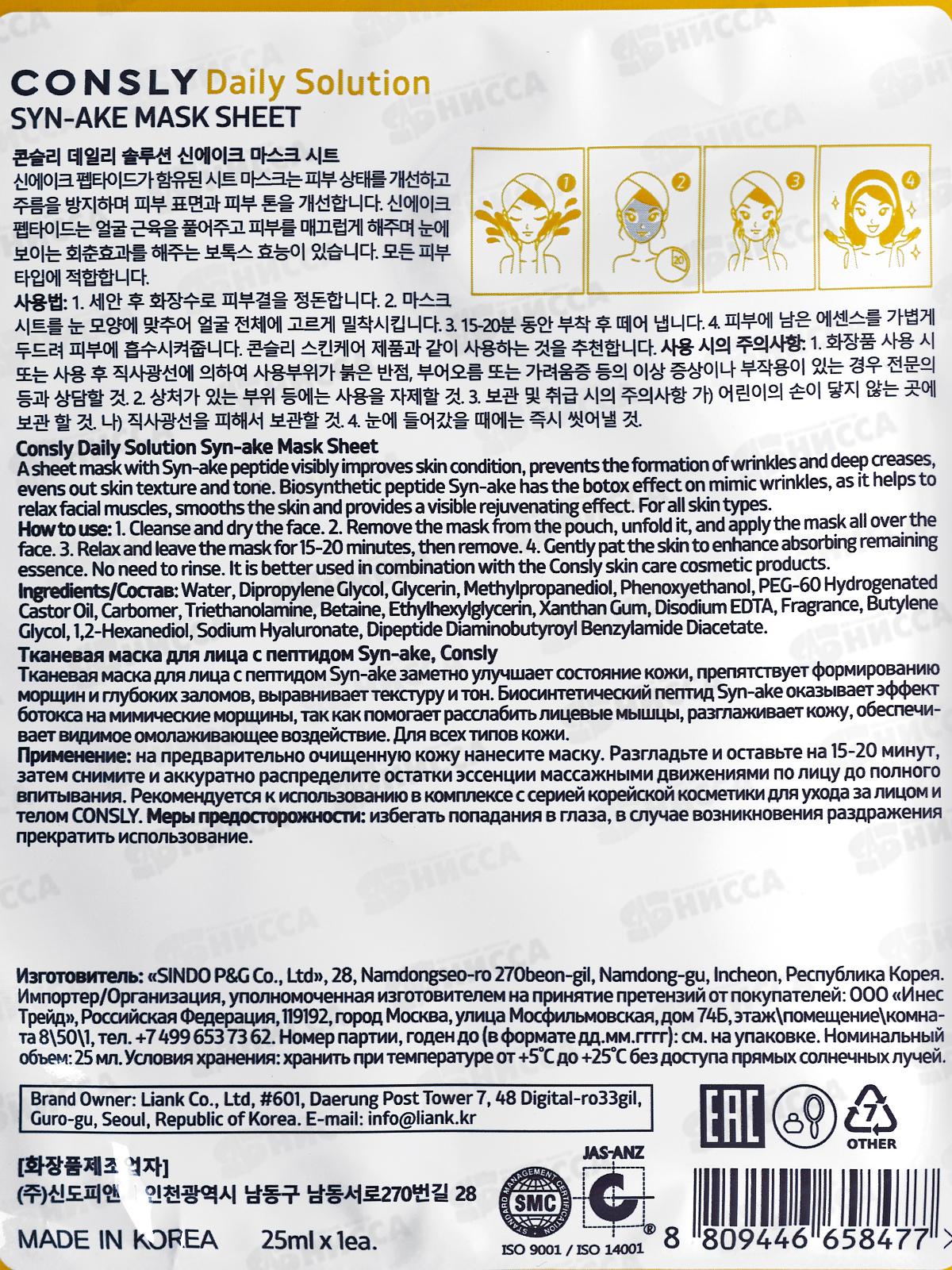 Consly Маска тканевая для лица с пептидом Syn-ake 25мл