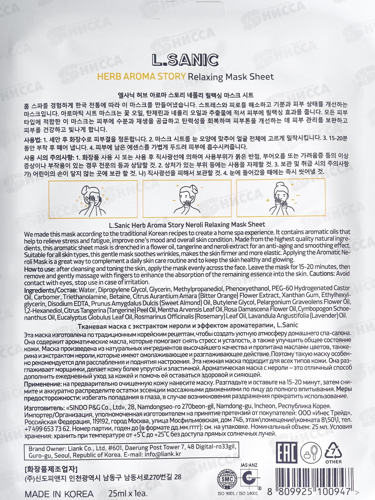 L.Sanic Маска тканевая H.A.A. с экстр нероли и эффект ароматер 25мл