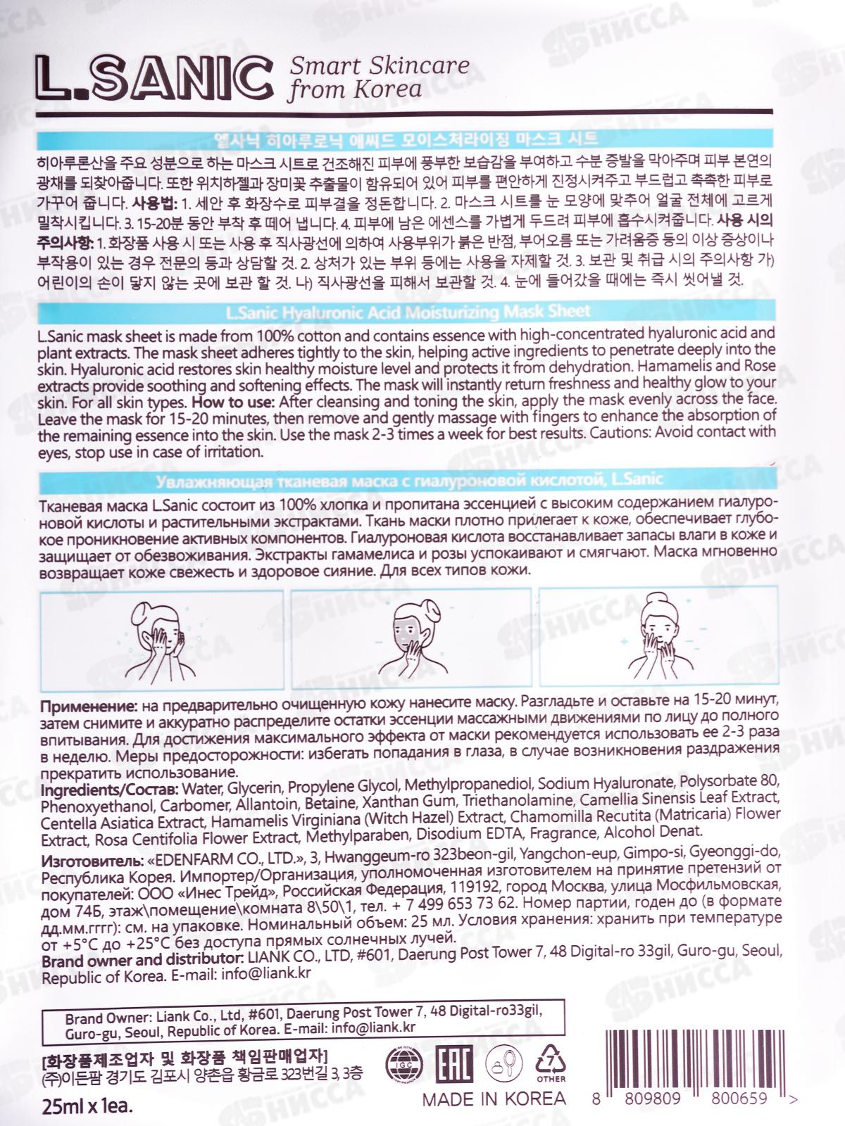 L.Sanic Маска тканевая увлажняющая с гиалуроновой кислотой 25мл
