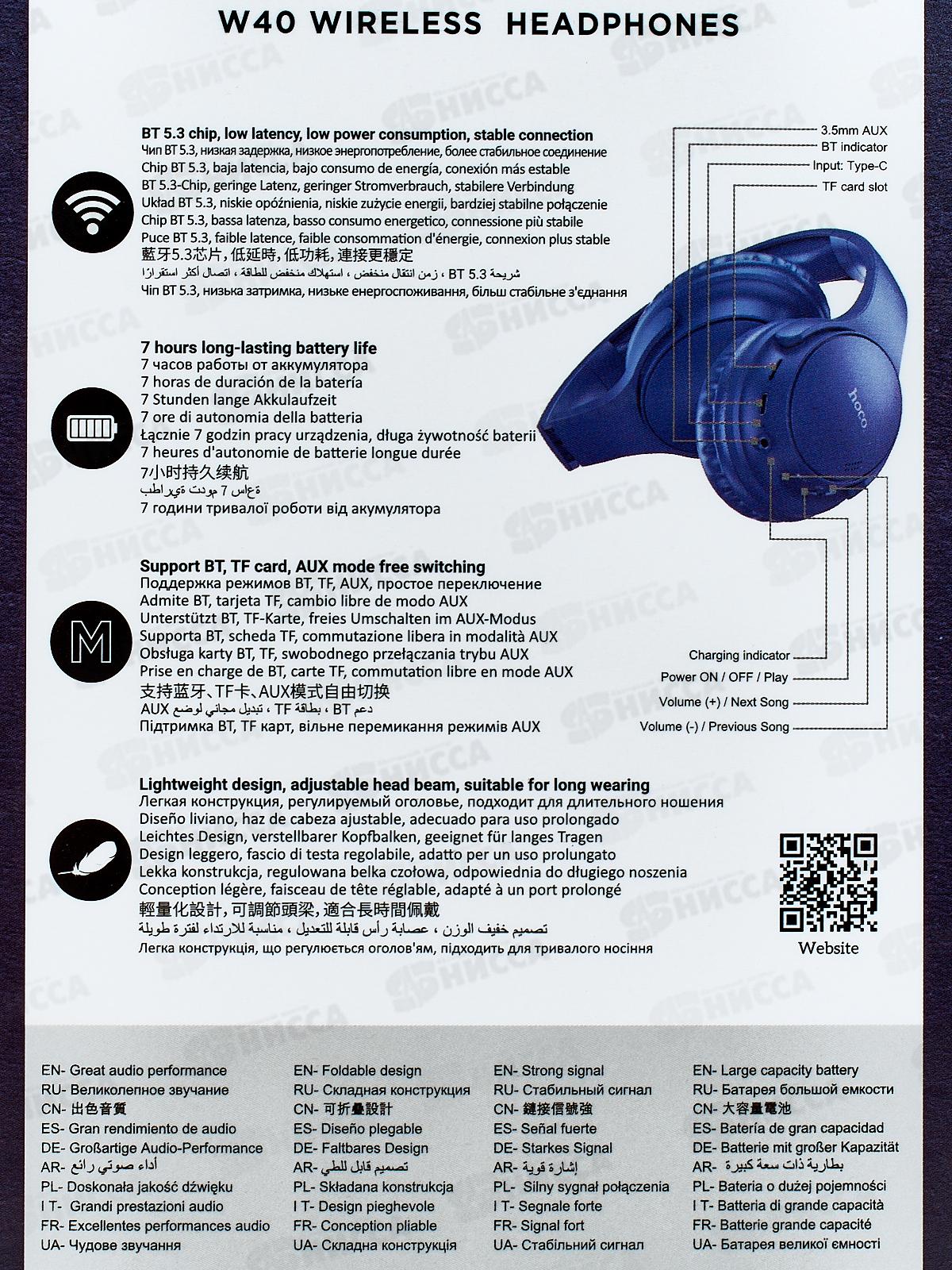 Наушники полноразмерные Borofone 5.3 200man Hoco W40 Mighty Blue