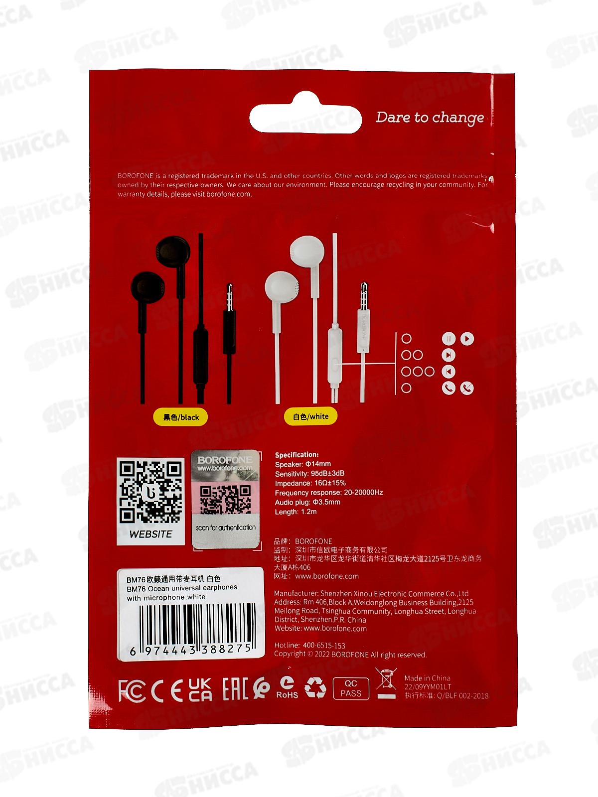 Наушники BOROFONE BM76 Ocean,вкладыши с микрофоном 1,2м белые